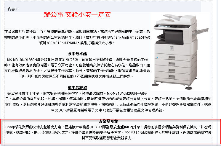 待機狀態下(只保留FAX功能)消耗電力不到1W,儲存在影印機硬碟中的複印資料將進行SSL加密保存,複印、傳真、掃描後的資料將自動從影印機硬碟中移除,也可自行設定每次影印是否需要輸入登入密碼,以防止重要資料流出。加購MX-FRX3U加密套件就能在機密文件中加入特殊資料,沒有得到授權進行影印時複印結果都是白紙一張。